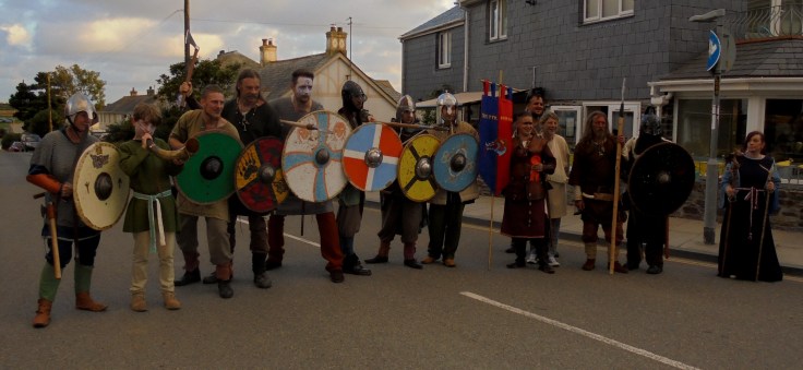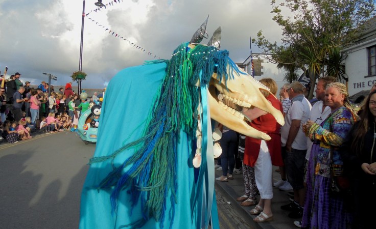 We prepared ourselves and Penglaz in a room at the Barbican and Cassandra stood at the open top window waving at the gathering crowd as they cheered and returned her wave. We made our entrance from the large black Barbican doors to lively music provided by the Golowan Band and cheers from the crowd. Mazey Eve is a wild celebration and extremely crowded, so keeping near Penglaz and making our way through a jostling crowd is quite a task! I observed Cassandra closely and on many occasions our movements were naturally identical which boded well for future development.